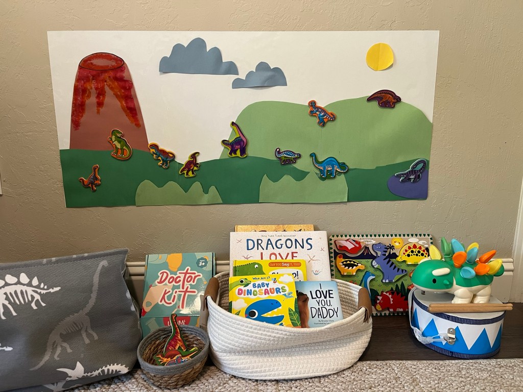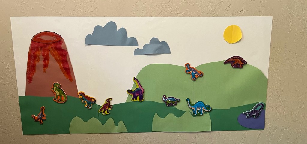 Another nap time rush creation! I got these dinosaur magnets for Logan but didn’t want to just throw them up on the board. So I created a quick landscape out of construction paper! If I had more time I would have added more detail, plants, trees etc. but this worked out just fine!