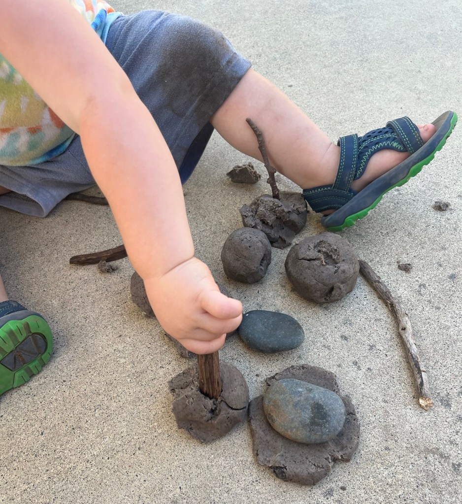 I will say, Logan was very excited to see Play-Doh outside! I collected some rocks sticks, leaves, and flowers for him to use in his dirt dough creations. He decided to make a bunch of “apples”.