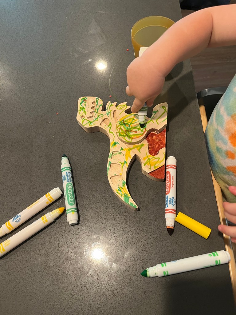 Logan chose to color his dinosaur with markers. When Logan was finished with his dinosaur, we put it at his sensory table.