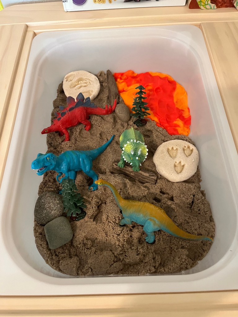 I also made these “dinosaur fossils” for the sensory table! I just made some salt dough, used the dinosaurs to press their feet and heads into it, even some leaves, and baked! To my surprise, Logan loved these! They served as loose parts for Logan’s play all week and he used them in a variety of different ways.