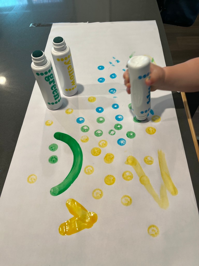 Ok, this kept Logan entertained for so long. Sometimes it’s the simple things! I put this in the “craft” section because originally it was going to go on cardstock and be hung up. Turned into a process art, which worked really well! You could do either