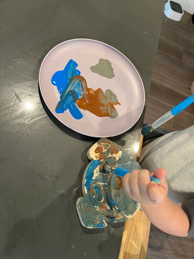 For the dog, he decided on paint (which worked much better). I chose brown and grey and he wanted to add some blue in there too