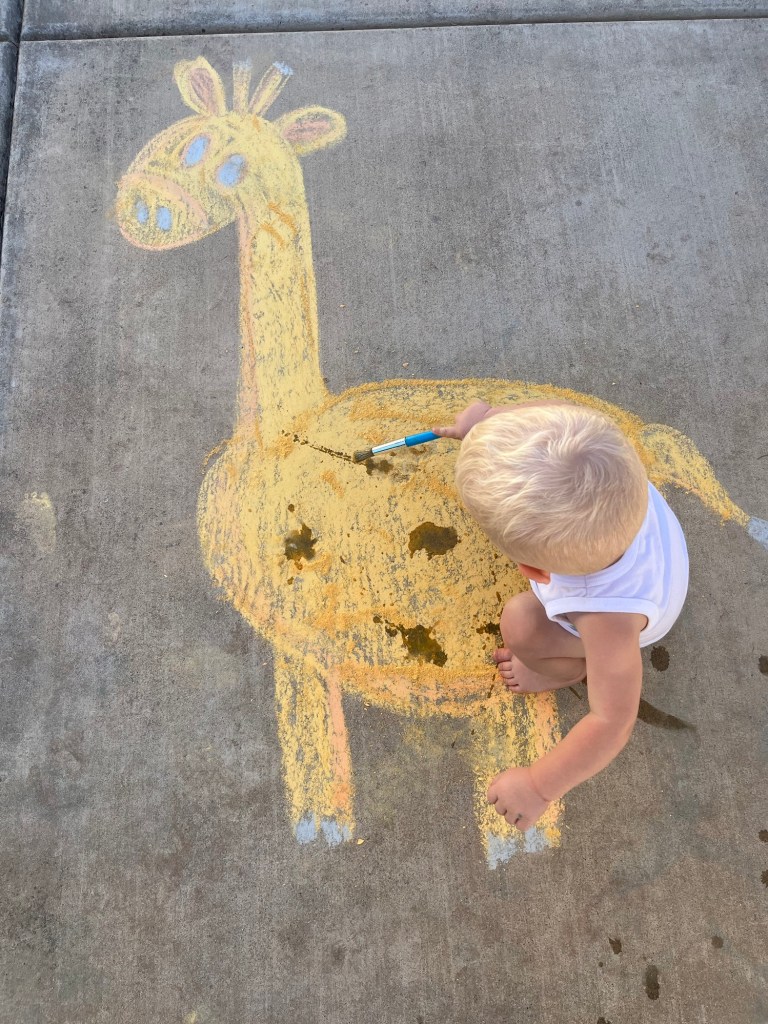 For this activity, I drew a giraffe out of chalk and left off the spots. I gave Logan a cup of water and some paint brushes and let him paint the spots on the giraffe with the paintbrush.
