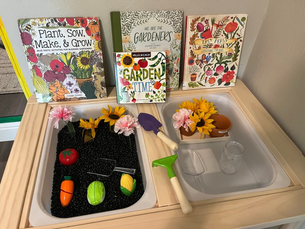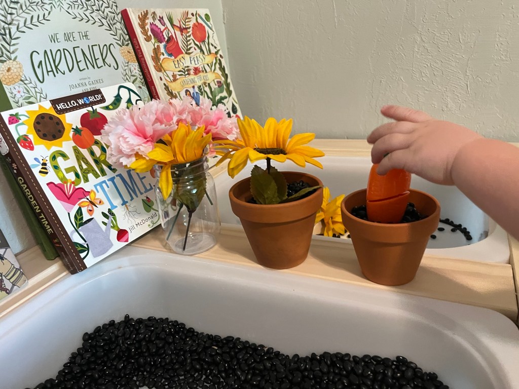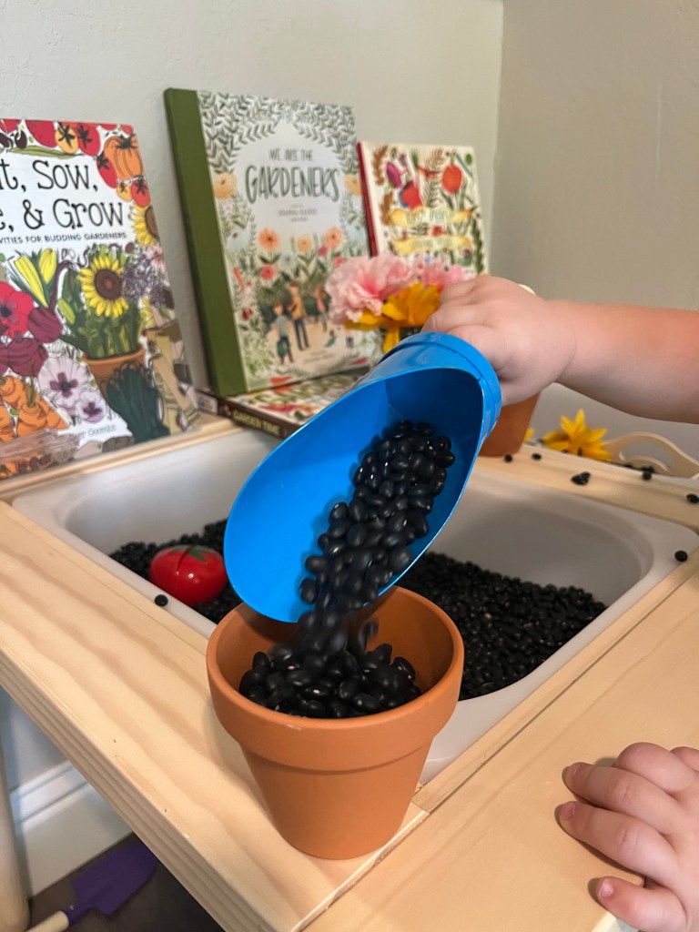 Once again, Logan loved the scooping and pouring with this sensory bin. He also got really into “planting” the flowers and fake food.