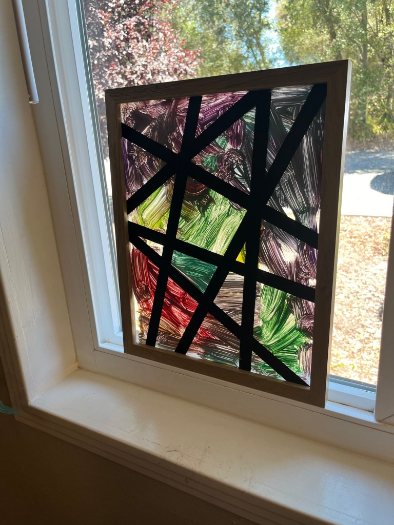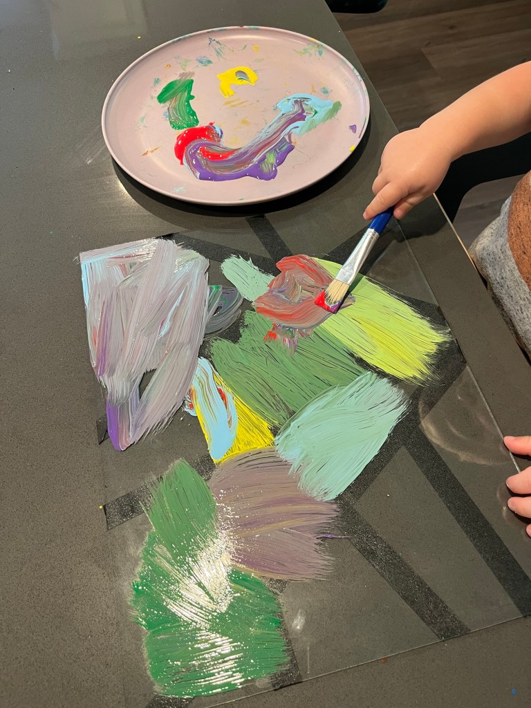 This activity would be super cool if you had an older child who could paint each section separately. Logan, like any toddler, wanted to see what color the paints made when they all mixed together. It still looked really cool when I put it in front of the window!