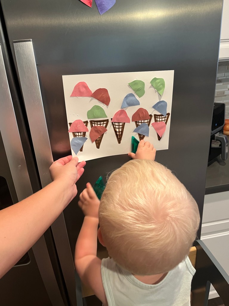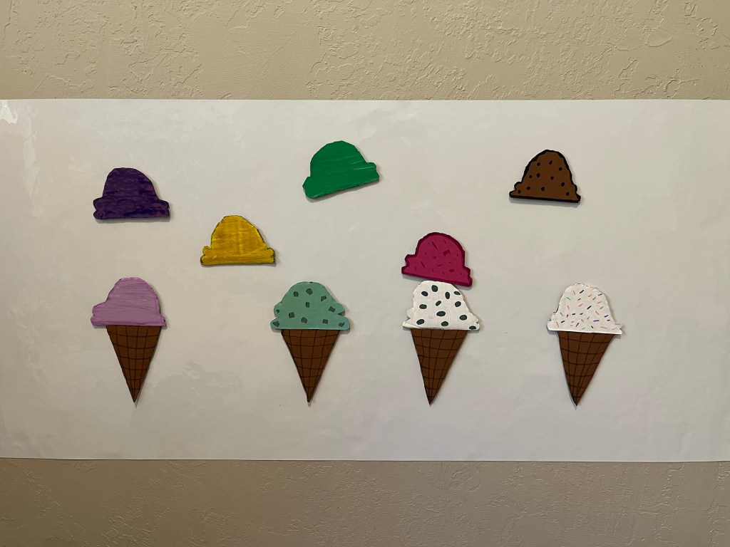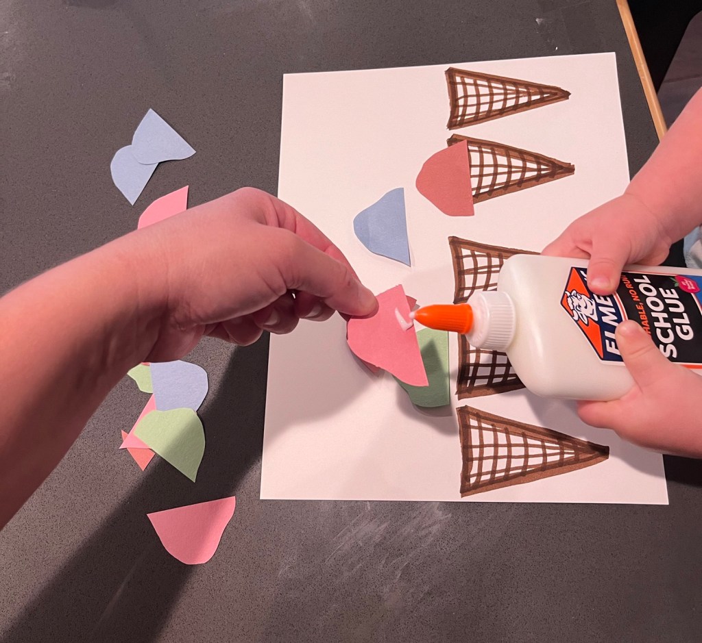 For this project, I drew some ice cream cones on a piece of paper and then cut out some ice cream shapes out of construction paper. Logan did this whole project by himself and chose where every scoop of ice cream went.
