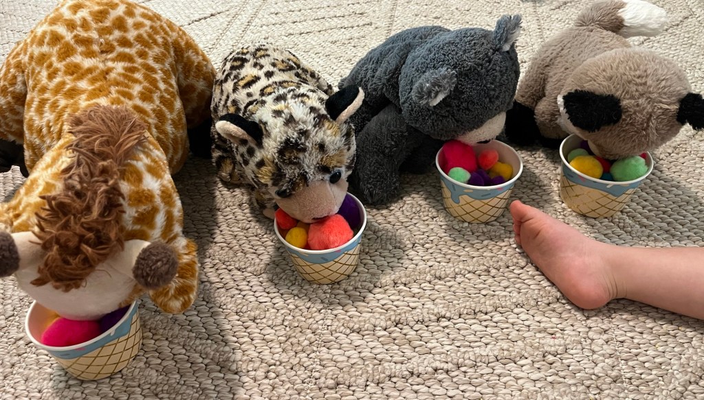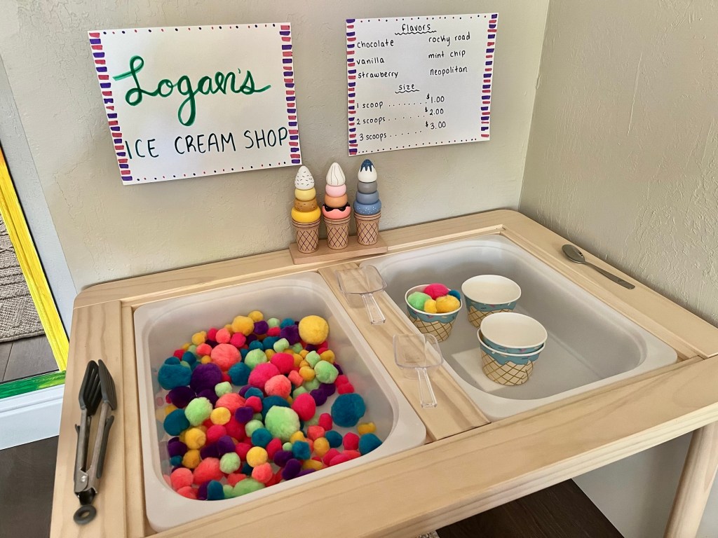 When I first introduced this bin to him, he played with it for easily 30 minutes non stop. He set up an ice cream party with all of his stuffed animals.