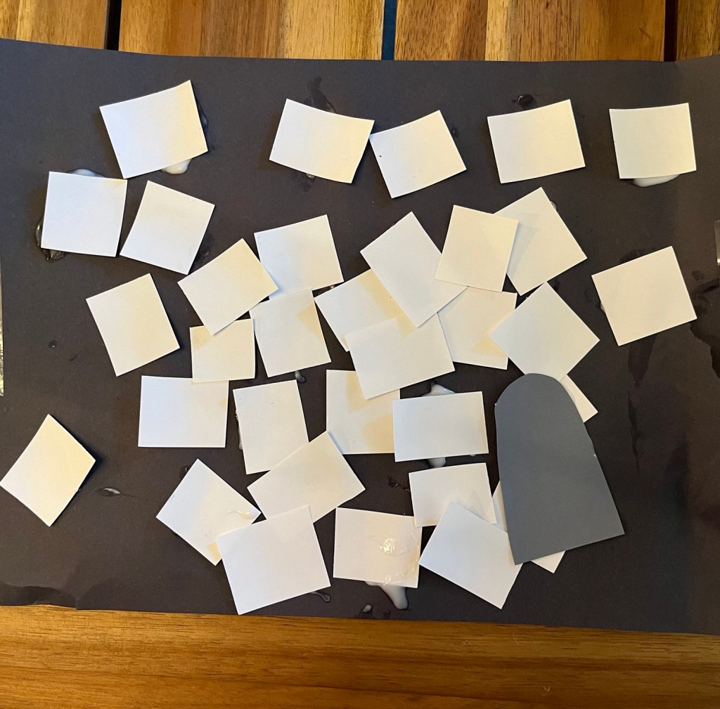Since he liked the gluing project so much the last time, I decided we would make a collage igloo! It turned out very abstract 😉 but again, Logan did this all himself and he loved it. He even chose the placement for the door