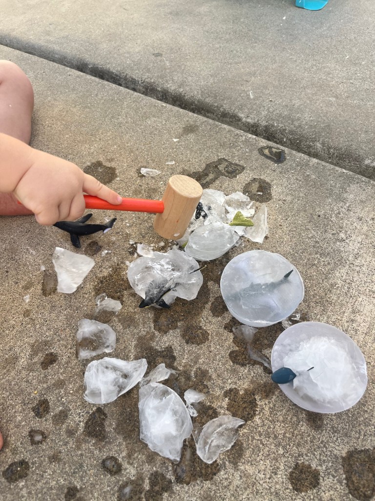 I wasn’t sure how this one was going to work out, or if his little wooden mallet would even do anything. Surprisingly, it worked really well and Logan loved it! Maybe because the animals were frozen inside the ice it wasn’t as structurally sound so it broke apart fairly easy when Logan hit it.