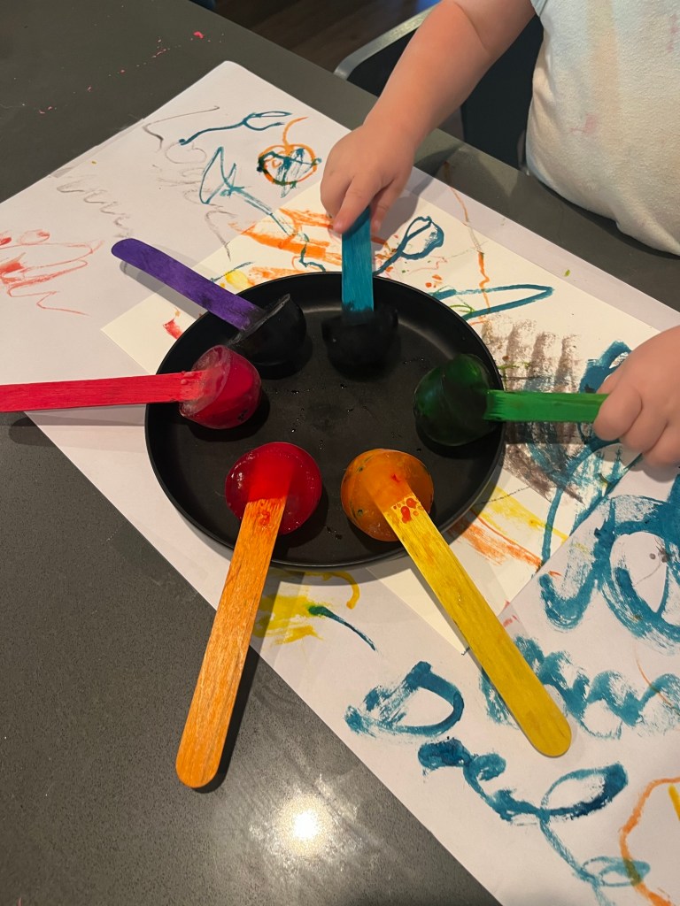 I mixed food coloring and water and froze them with popsicle sticks. When they were frozen, we could take them out and use them to paint with. It was really cool, it look like watercolor paints!