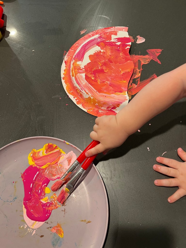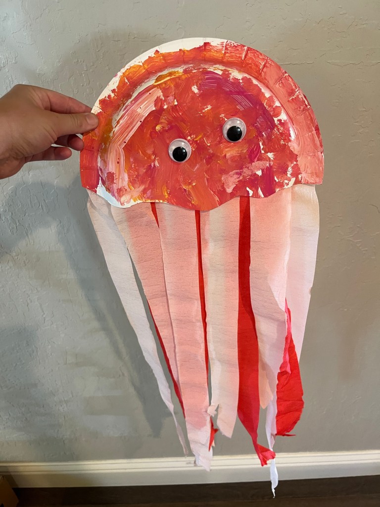 Started the week off strong with a jellyfish craft! I cut a paper plate in half and let him paint it with a couple colors. For more efficiency, Logan decided to implement a double paintbrush strategy.😂