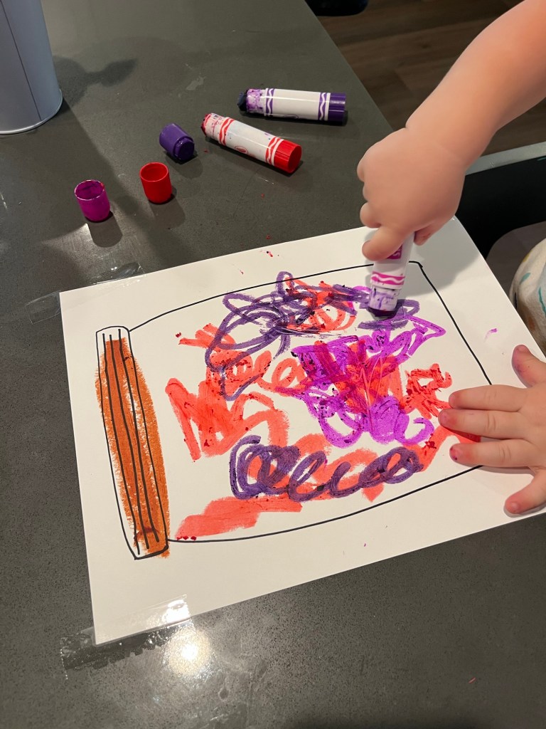 I wanted to challenge Logan to a little bit more of a “structured” art activity. I drew a jar and instructed Logan to color inside the jar with colors that could represent fruit jam.