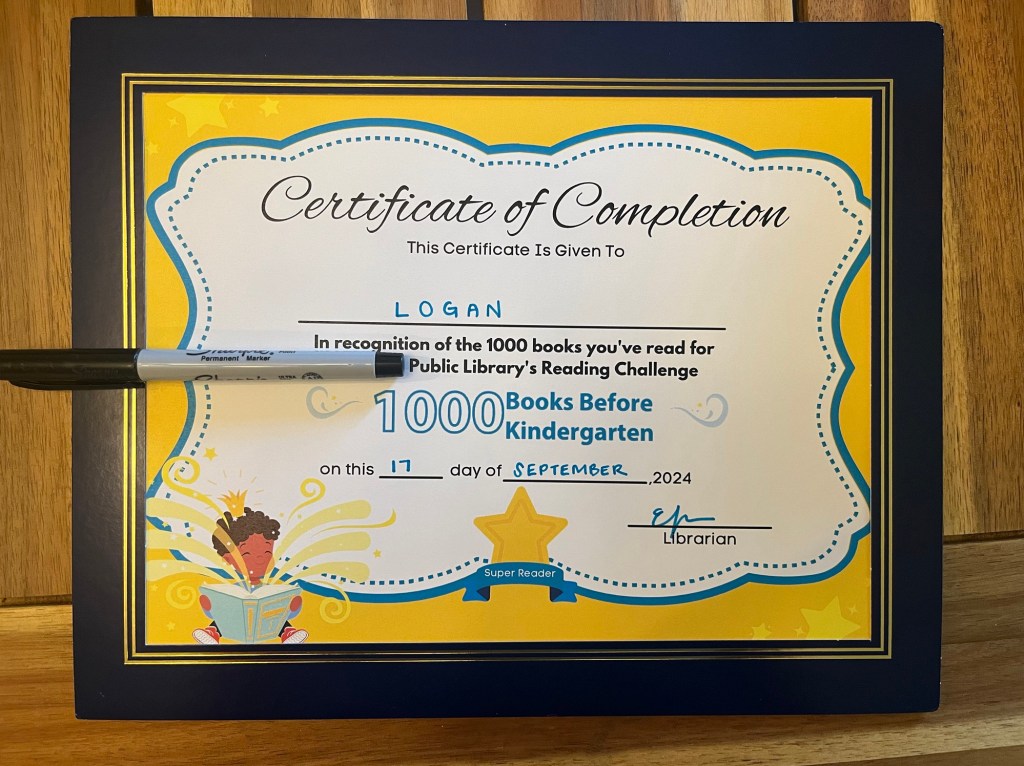 Logan also completed the “1000 Books Before Kindergarten” program! He got a certificate, a reading buddy and his picture taken.