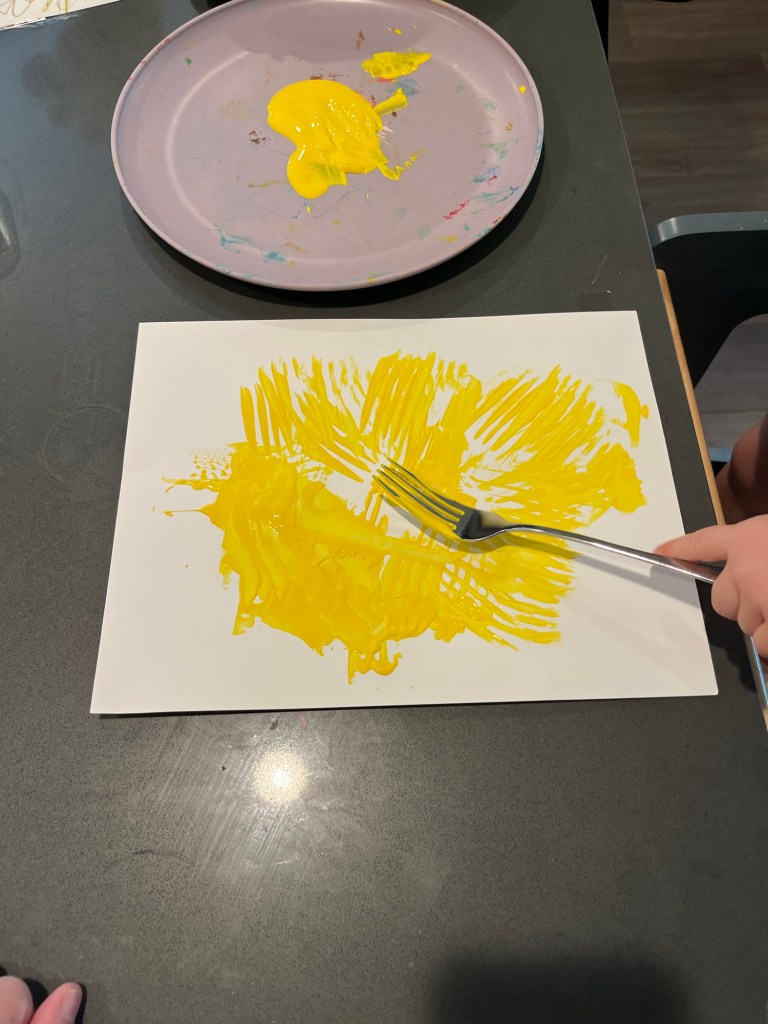 This one would be so fun for older kids so they can actually get the strokes of the fork down to make it look like hair! Logan used the fork like a paintbrush and just pushed it around, which is totally fine too! Process over product, remember!