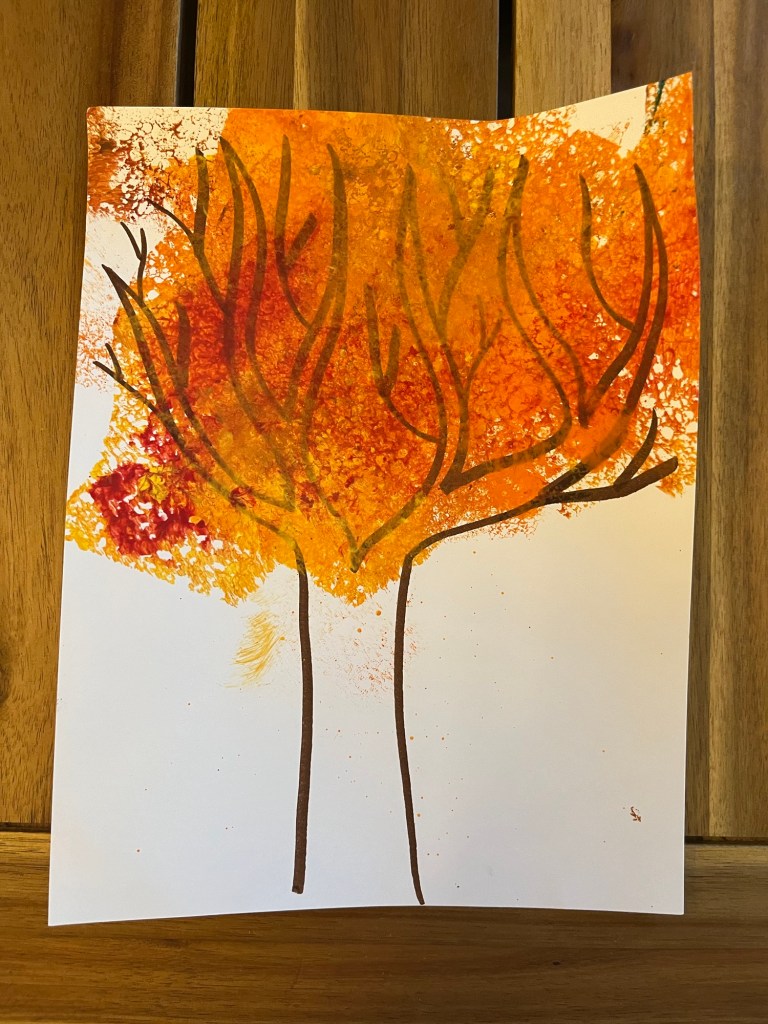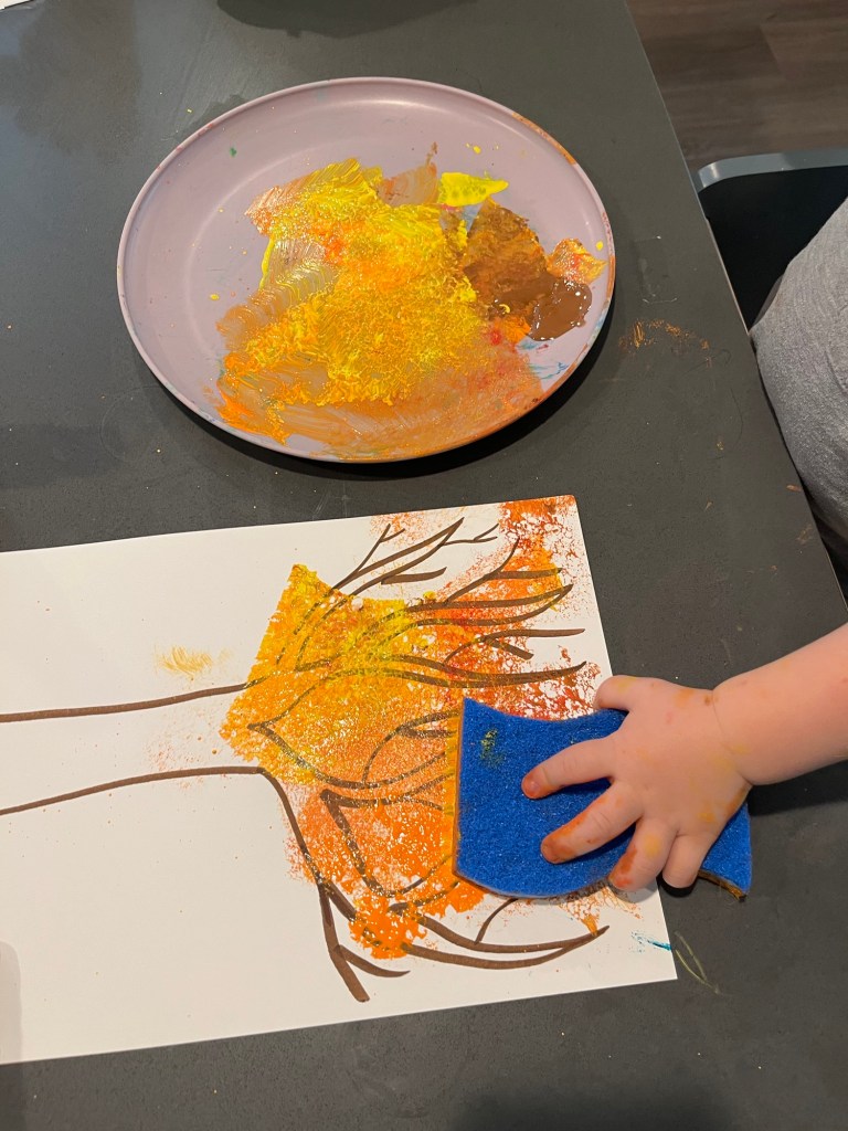 At first I had the idea to collect leaves outside and let Logan glue them on (which would still be fun to do!) but he has never used a sponge to paint before. I thought it would be a pretty way to mix the fall colors.