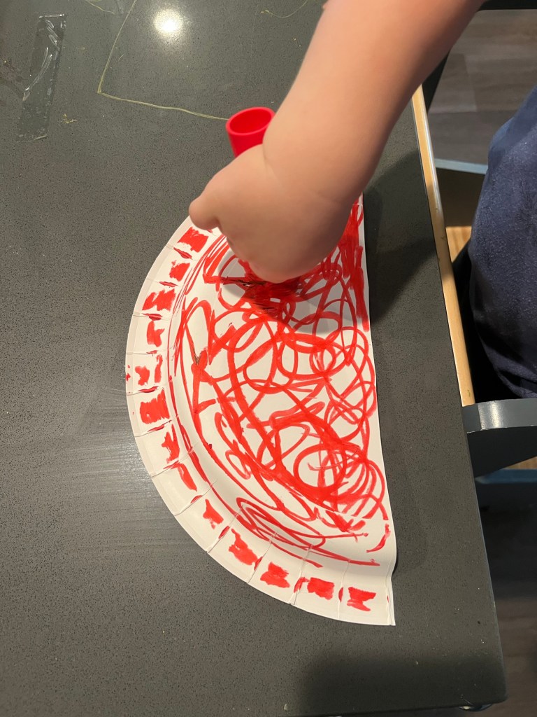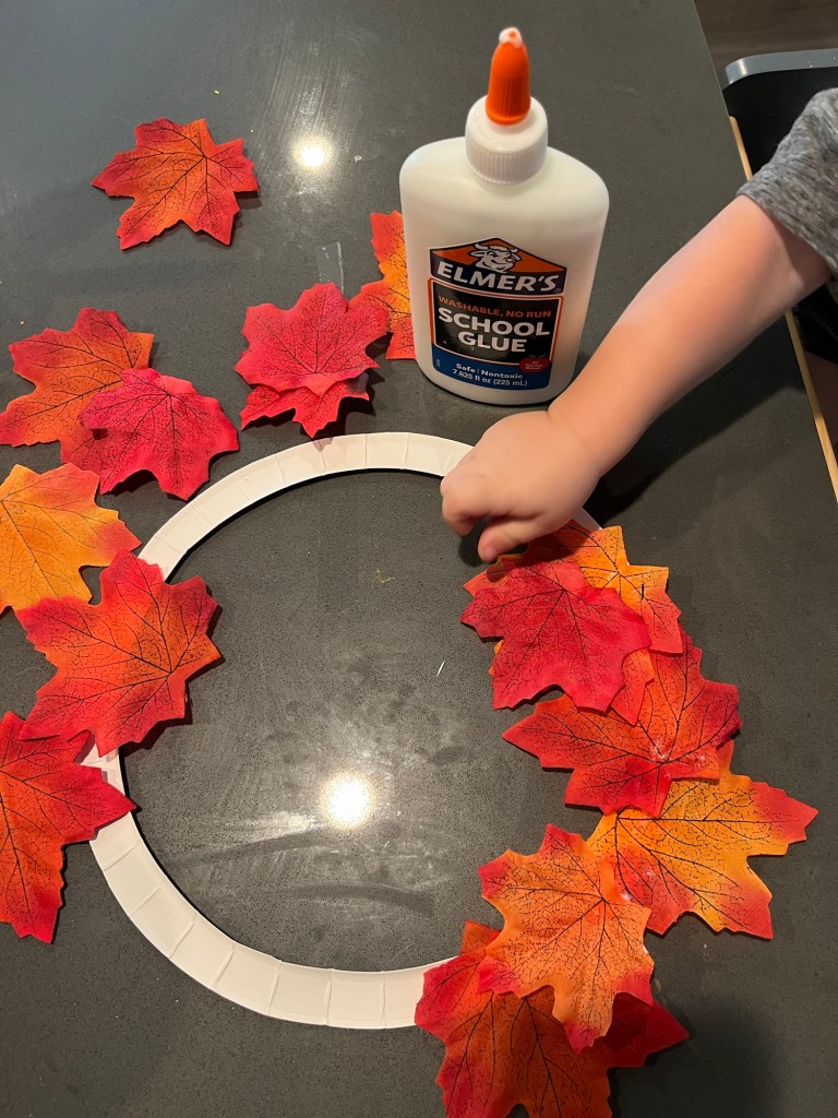This project took forever to complete and that’s ok! My toddler definitely did not sit here and glue every single leaf on the whole wreath in one go. He would do a couple at a time and then be done with the project, only to revisit it a couple hours later!